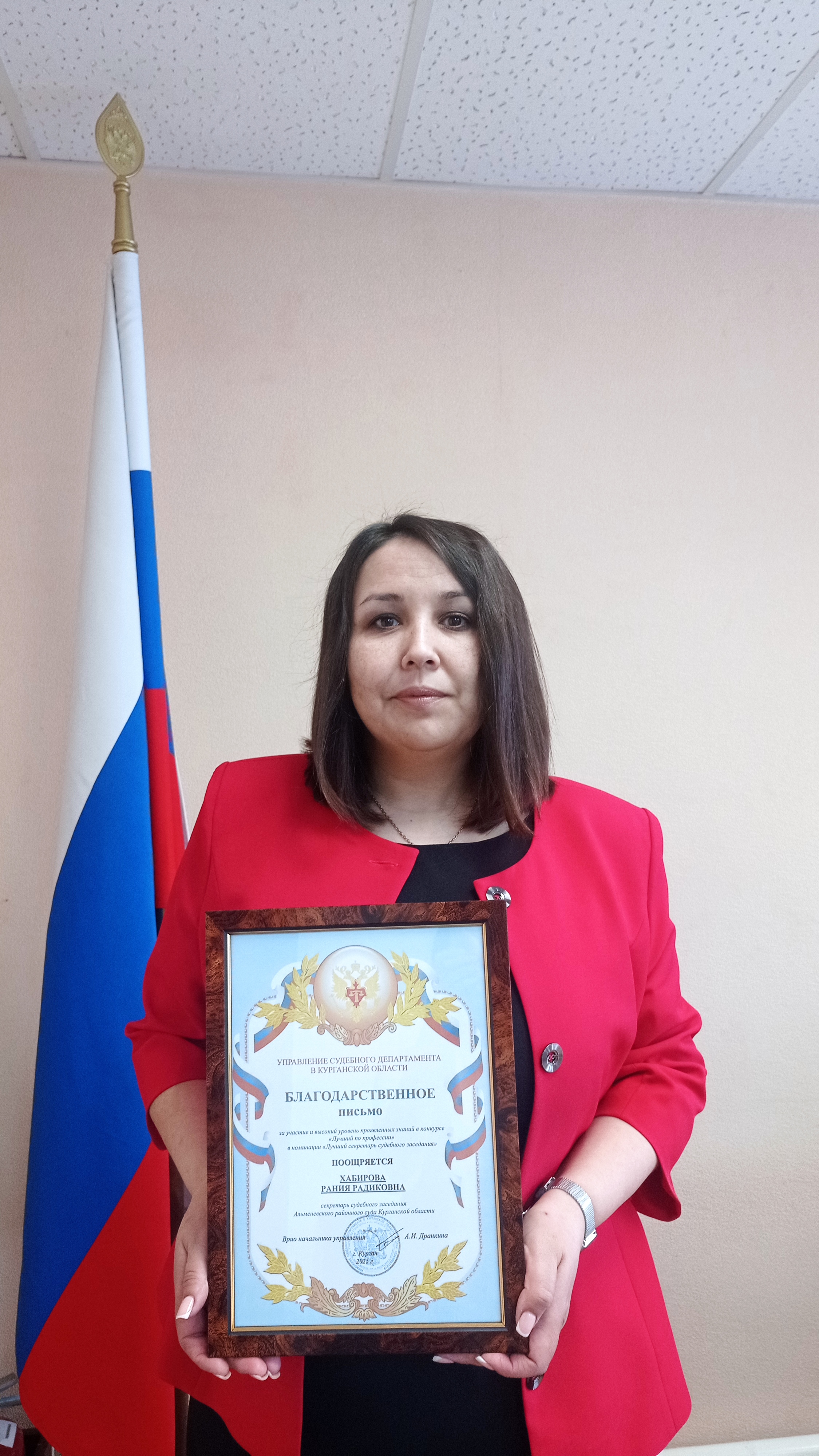 ![]() 6 марта 2025 г. Управлением Судебного департамента в Курганской области подведены итоги ежегодного конкурса «Лучший по профессии», проводимого в целях выявления и распространения положительного опыта работы работников аппаратов районных судов Курганской области, повышения заинтересованности работников аппаратов районных судов в непрерывном совершенствовании профессионального мастерства и повышении эффективности служебной деятельности, а также повышении авторитета профессии. По итогам конкурса секретарь судебного заседания Альменевского районного суда ХабироваРанияРадиковна вошла в тройку призеров области. Приказом начальника Управления Судебного департамента в Курганской области за участие и высокий уровень проявленных знаний в конкурсе «Лучший по профессии» в номинации «Лучший секретарь судебного заседания» Хабирова Р.Р. поощрена Благодарственным письмом. Начальник общего отдела Альменевского районного суда Юлия Валикаева Опубликована в газете «Трибуна» №10 (8855) от 13.03.2025 |